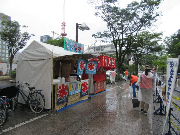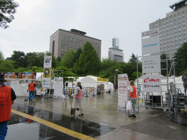 今年は、被災地の復興への思いと、全国の支援者の気持ちをつなげていくという意味をこめて「つなぐ」をテーマに開催された。 恒例となった清掃奉仕活動は、初日の6日午前8時から前夜に行われた花火大会に多数の人手があったため、草むらに隠れたペットボトル、空き缶、紙くず、タバコの吸殻が目立ち、開始して間もなくゴミ袋がいっぱいになるほどの作業だった。 作業メンバーは、時折降る小雨と湿度の高い蒸し暑さのなか、汗を流しながら黙々とゴミを拾い続け、祭りに来る観光客が気持ちよく過ごせる環境作りに尽力した。