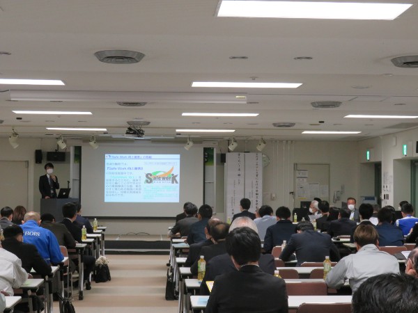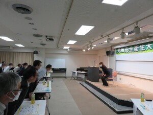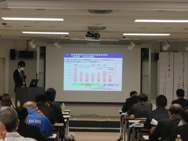 労働安全対策委員会相馬委員長による開会宣言で大会が始まり、宮城労働局労働基準部健康安全課 地方産業安全専門官 斎藤俊英様に「ビルメンテナンス業における労働災害発生状況について」のご講演、続いて一般財団法人宮城県成人病予防協会 健康運動指導士 北目衛子様に「守りたい!肩・腰・ひざ」についてご講演いただきました。
