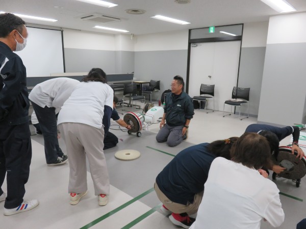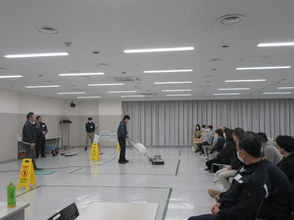 1時間の学科講習(清掃の基礎について)の後、実技講習(ポリッシャー等)を行いました。