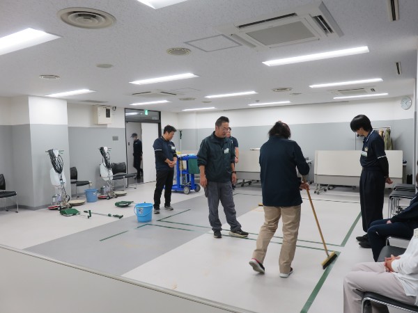 午後からは、実際に清掃器具を用いての実技指導を行いました。ダスタークロスやモップを用いての、「掃く」「拭く」といった基本的な清掃技術から、ポリッシャーの操作も体験していただきました。