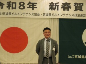 能登半島地震の被災者へ黙祷を捧げ、大久保会長の挨拶に続き、村井知事、郡市長、伊藤環境大臣よりご祝辞をいただきました。そして一般社団法人宮城県ペストコントロール協会会長佐藤昌司様による乾杯のご発声で歓談となりました。大変賑々しく新年の挨拶や交流を深める有意義な会となりました。賛助会員に新規ご入会いただいた㈱シー・アイ・シー東北支社支社長の渡邉元様の中締めでお開きとなりました。